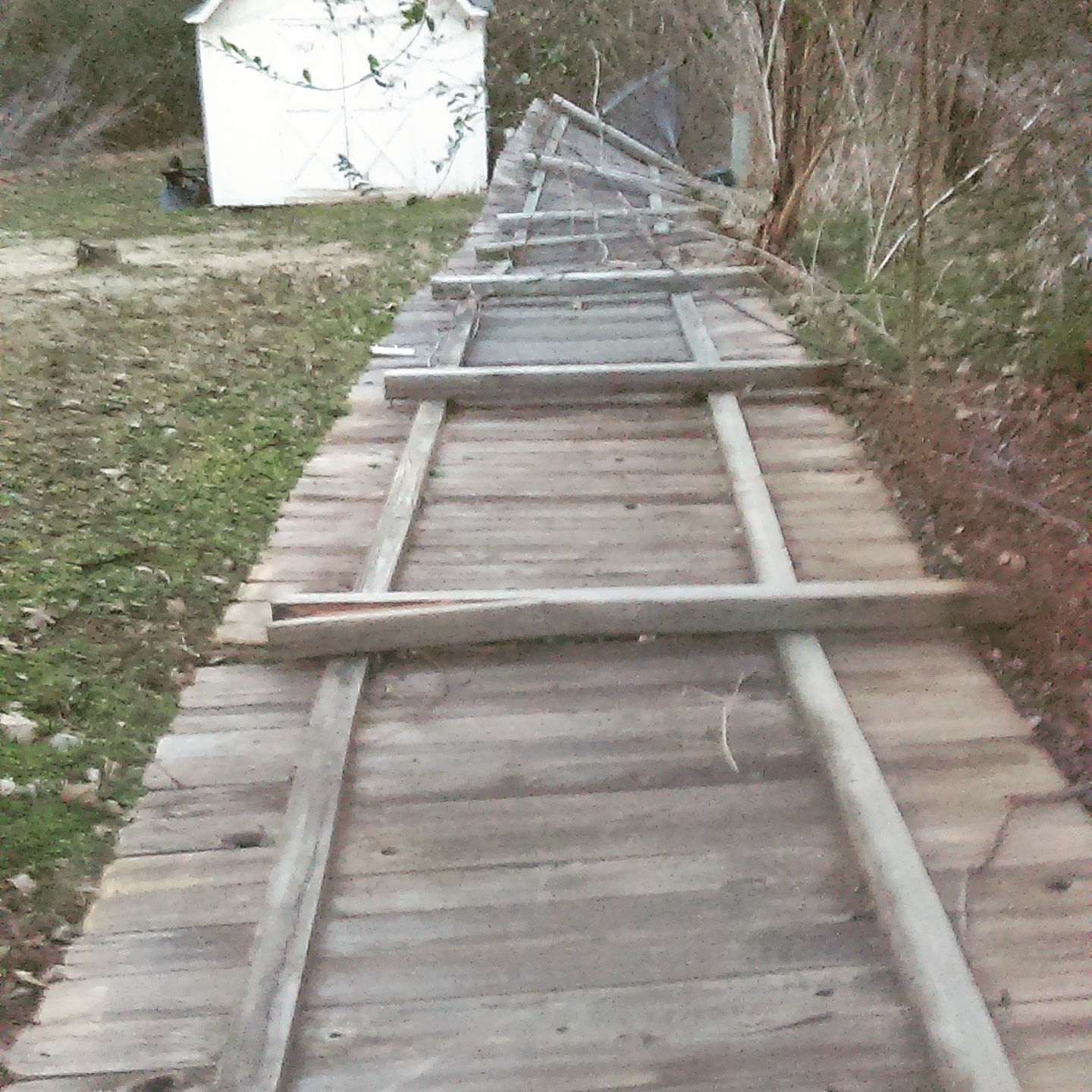 Yesterday morning, as I was watching the dogs romp in the yard, I texted Johnny about the fence on the north side of our yard: "I noticed one of the crepe myrtles pushing on that fence, which does not look like it can stand that for long." The house's previous owners were really into planting trees and shrubs as close to the fence lines as possible; last summer, our neighbor paid another neighbor to come trim the crepe myrtles pushing on his side of the fence. (That's another story; I fear the poor crepe myrtles will never recover.)